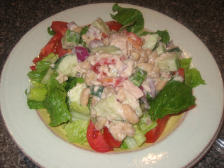 What I am really starting to like is her magazine, Everyday with Rachel Ray. I don’t subscribe to it (although I did just place my order), but I pick it up every now and then. I have found several recipes in there that have turned out really good. And most are fairly simple….like this one. This salad is perfect for a busy weekday night or lunch. We had it with our cream of mushroom soup the other night and it was delicious.